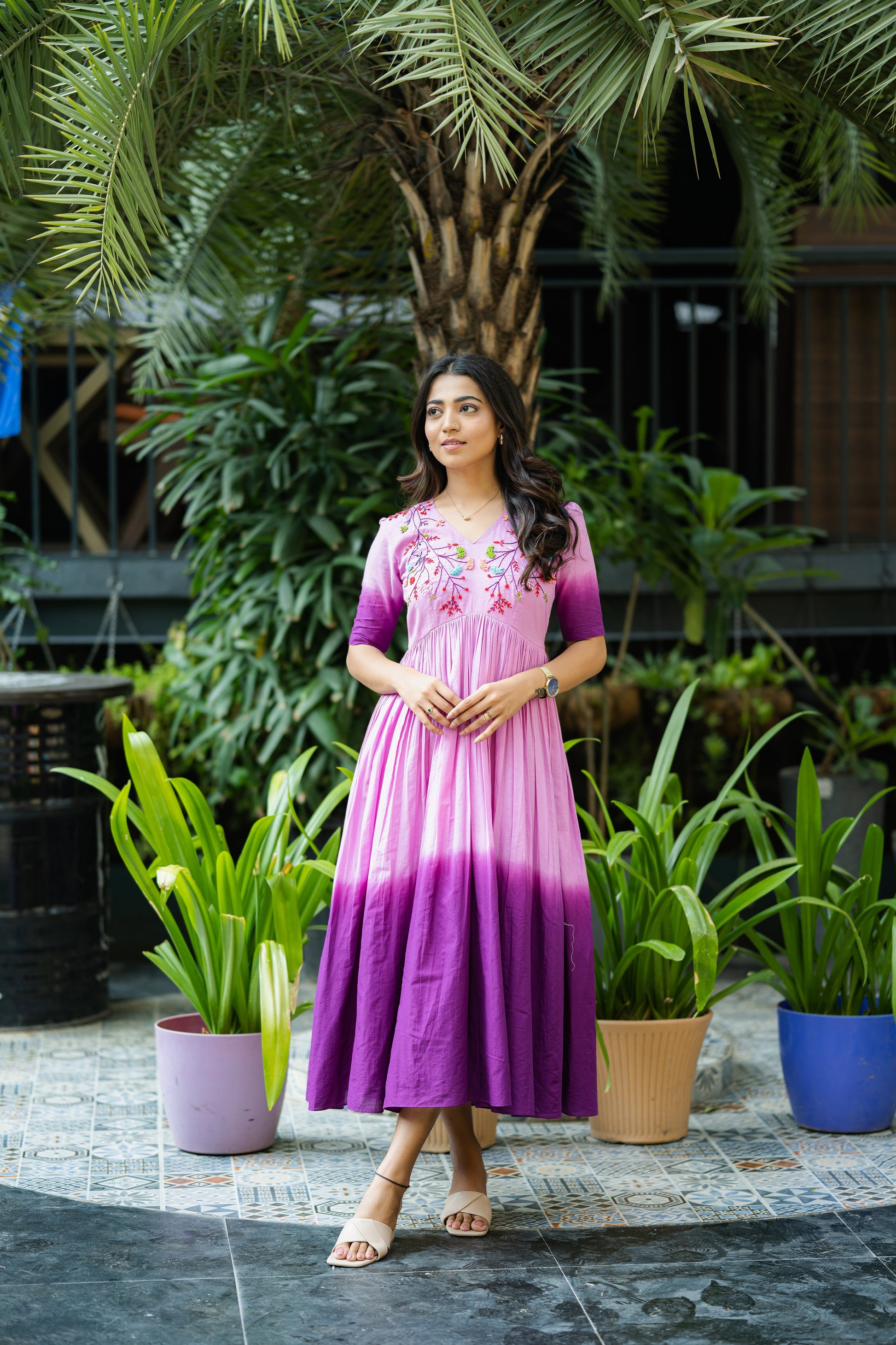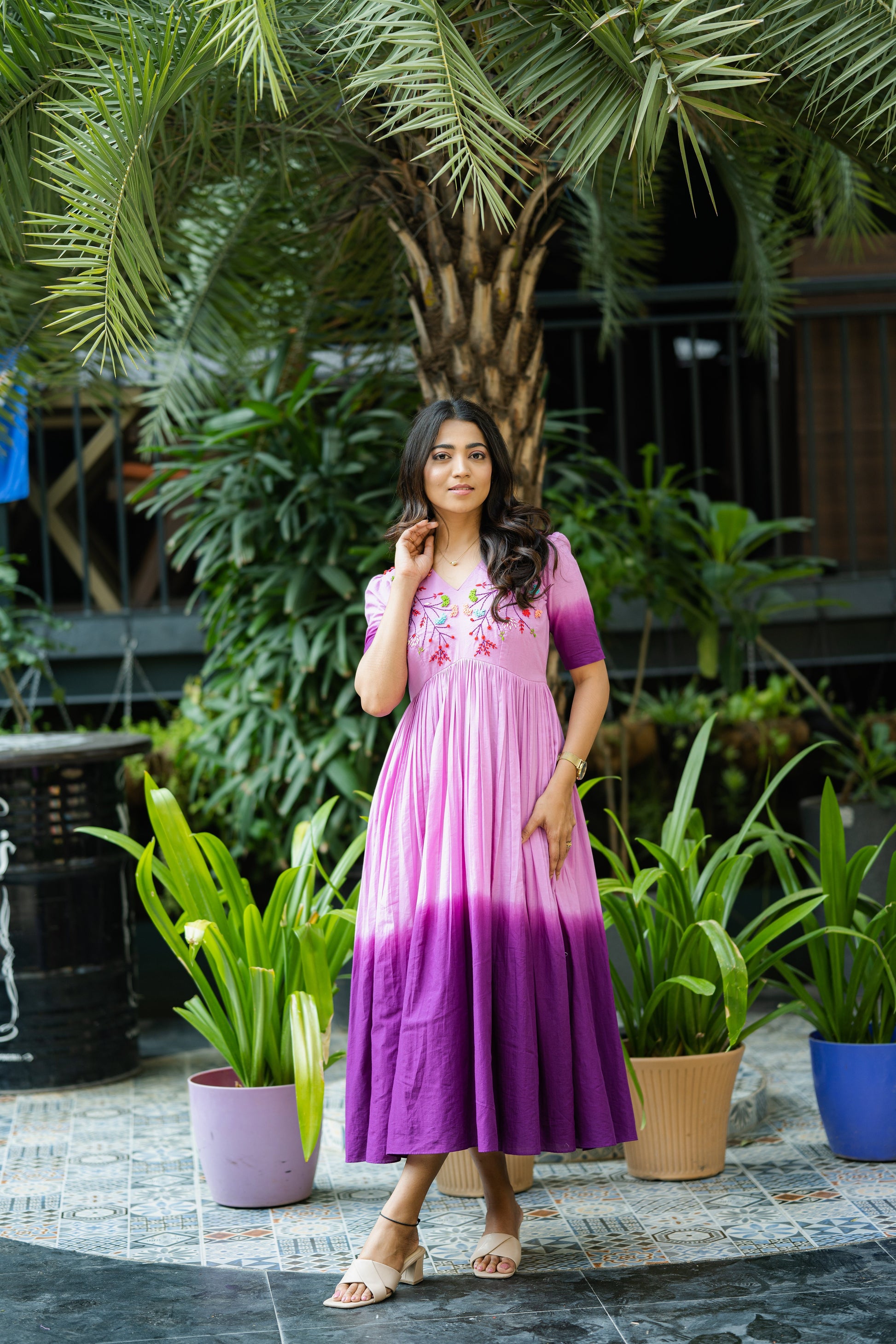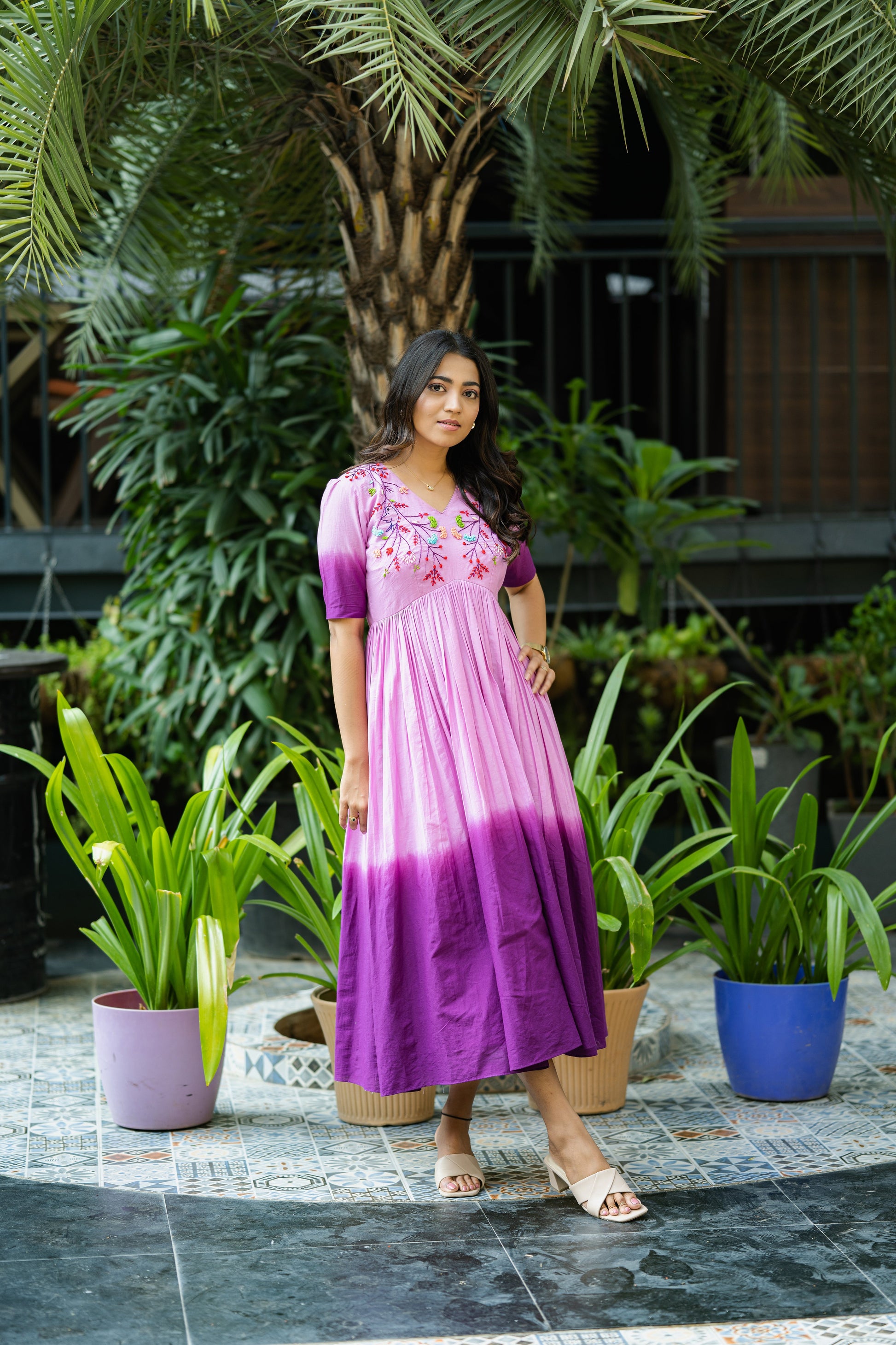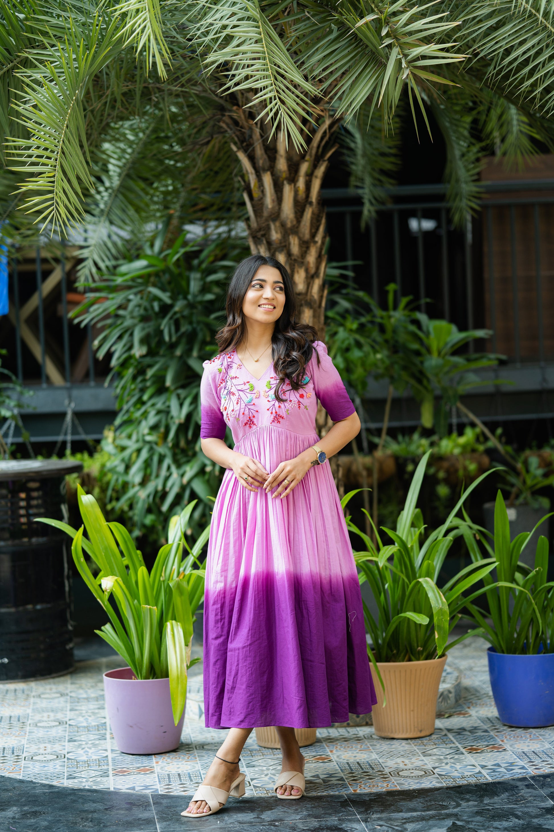 Experience the soft, luxurious comfort of our Dhaaga Purple Ombre Dress. Made from high-quality mulmul cotton, this dress features stunning hand work on the yoke in a vibrant array of colors. Perfect for any occasion, this dress is a must-have for the style-conscious and comfort-seeking fashionista.